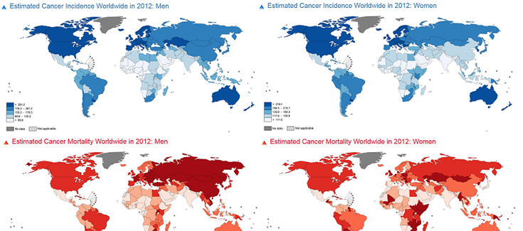 En azul incidencia y en rojo mortalidad del cáncer, según GLOBOCAN 2012. A la izquierda hombres y a la derecha mujeres. IARC, OMS.