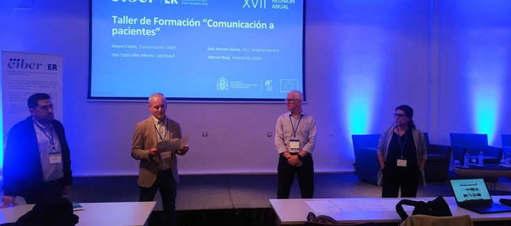 El taller, moderado por Miquel Calvet, colaborador del Departamento de Comunicación del CIBER, contó con la participación de Manuel Rego, presidente de la Federación ASEM y presidente del Consejo Asesor de Pacientes del CIBERER; Mar Fatjó-Vilas, investigadora de Área CIBER de Salud Mental (CIBERSAM); y José Antonio Solves, profesor de comunicación de la Universidad CEU Cardenal Herrera, miembro de la Asociación ALBA y persona con albinismo.