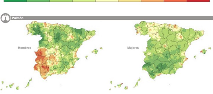 El nuevo mapa también expone los muertos por cáncer de pulmón, más de 340.000 en el periodo de estudio. Las zonas con mayor riesgo de mortalidad en los hombres se localizan en Extremadura, Andalucía occidental (Huelva, Sevilla y Cádiz), Asturias y Cantabria. En las mujeres, los mayores riesgos se encuentran en algunos pueblos de Pontevedra y Ourense. Aunque la distribución del cáncer de pulmón se relaciona con el número de fumadores, los investigadores también apuntan a la contaminación atmosférica. Y, en el caso de los pueblos gallegos, los científicos señalan al radón, un gas radiactivo que se origina de manera natural a partir del uranio del subsuelo.